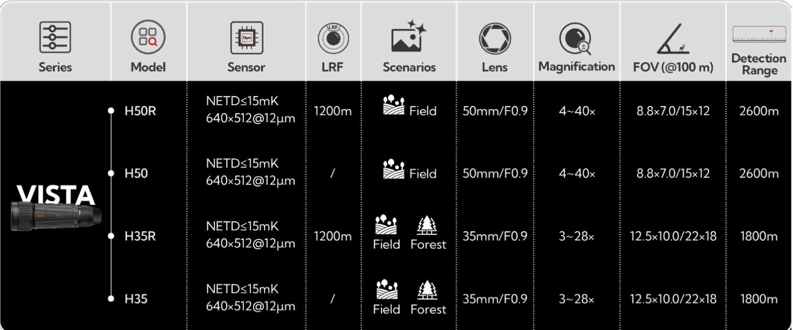 Equipado con un sensor superior y un LRF integrado, Vista ofrece un rendimiento de primer nivel en la industria.